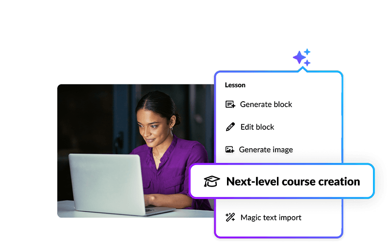 Generate quizzes, knowledge checks and course summaries in a flash. AI Assistant saves you precious time so you can skip time spent on repetitive tasks and focus on developing strategy.